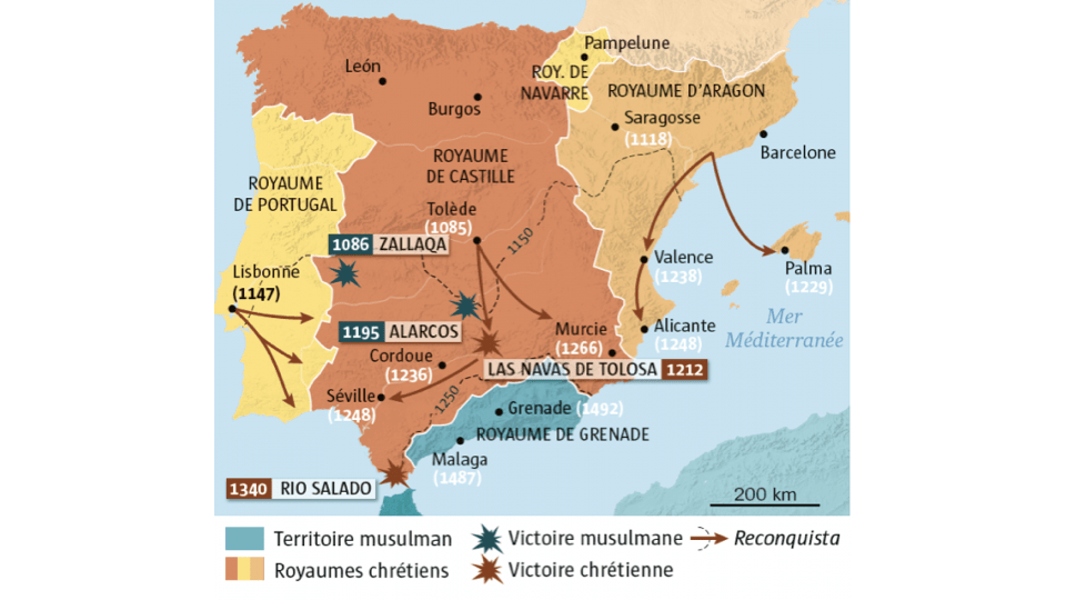 Au Moyen Âge, les conflits religieux et territoriaux sont fréquents, notamment à travers les Croisades, des campagnes militaires lancées par les chrétiens pour reprendre Jérusalem et la Terre sainte des mains des musulmans. Ils sont également marqués par les affrontements entre l’Empire byzantin et les califats musulmans, alimentés par des revendications territoriales et des divergences religieuses. En parallèle, en Espagne, la Reconquista est une lente reconquête des territoires occupés par les musulmans par les rois catholiques, qui culmine avec la prise de Grenade en 1492.
