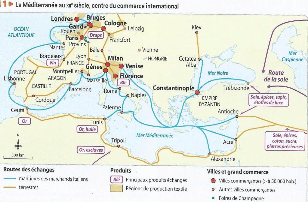 Au Moyen Âge, les échanges commerciaux en Méditerranée sont très importants. Les villes portuaires comme Venise, Gênes ou Marseille jouent un rôle central, en facilitant le commerce entre l’Europe, le Moyen-Orient et l’Afrique du Nord. Les marchands transportent des produits variés : épices, soie, tissus, métaux ou céramiques. Ces échanges permettent non seulement le développement économique des cités, mais aussi des contacts culturels et technologiques entre les différentes régions. Les routes maritimes et terrestres favorisent ainsi l’enrichissement des villes et le renforcement des réseaux commerciaux méditerranéens.