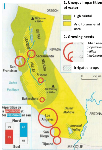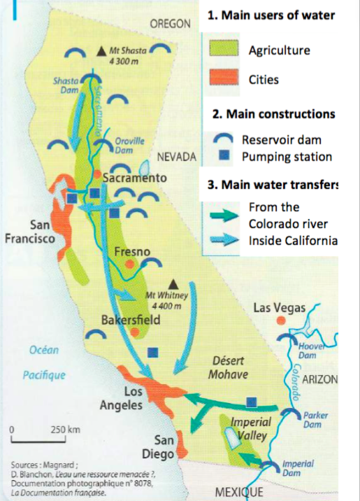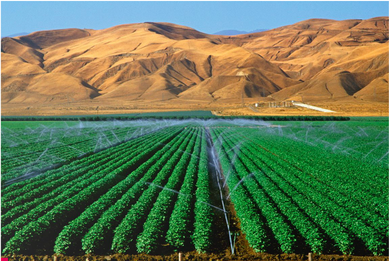 - Central Valley – Major agricultural region producing almonds, grapes, lettuce, and other crops; heavily irrigated.