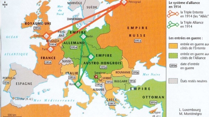 La Première Guerre mondiale, qui éclate en 1914, a plusieurs causes. Les rivalités territoriales et économiques entre grandes puissances européennes, comme l’Allemagne, la France et le Royaume-Uni, exacerbent les tensions. Le nationalisme intensifie les conflits d’intérêts et les sentiments patriotiques, tandis que les alliances militaires obligent les pays à entrer en guerre pour soutenir leurs partenaires. Enfin, la course aux armements et les tensions dans les Balkans constituent des facteurs déclencheurs de ce qui va devenir “la grande guerre”.