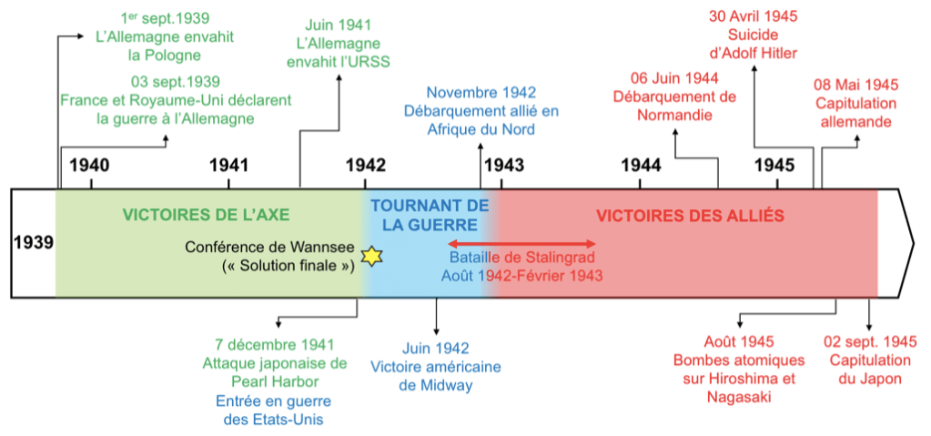De 1942 à 1945, la guerre connaît un tournant et marque la lente marche vers la victoire des Alliés. Après les premières victoires de l’Axe, les forces alliées reprennent l’avantage : en 1942, les Américains stoppent les Japonais à Midway dans le Pacifique, et les Soviétiques remportent la bataille de Stalingrad en 1943, marquant le recul de l’armée allemande. En Afrique du Nord, la victoire alliée à El-Alamein ouvre la voie au débarquement en Italie en 1943. Le 6 juin 1944, le débarquement de Normandie permet la libération de la France et prépare l’offensive finale. En mai 1945, l’Allemagne capitule, suivie en août par le Japon après Hiroshima et Nagasaki, mettant fin à la Seconde Guerre mondiale.