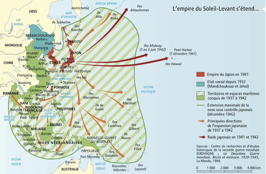 De 1941 à 1945, la guerre du Pacifique oppose le Japon aux États-Unis et à leurs alliés. Le conflit s’ouvre avec l’attaque surprise japonaise sur la base américaine de Pearl Harbor en décembre 1941, qui entraîne l’entrée en guerre des États-Unis. Dans un premier temps, le Japon étend rapidement sa domination sur l’Asie du Sud-Est et le Pacifique. Mais dès 1942, la bataille de Midway marque un tournant : la flotte japonaise subit de lourdes pertes. Les Américains mènent alors une stratégie de « saut d’île en île » pour reconquérir progressivement le Pacifique. Après de violents combats, dont Iwo Jima et Okinawa, les États-Unis utilisent l’arme atomique en août 1945 à Hiroshima et Nagasaki, forçant le Japon à capituler.